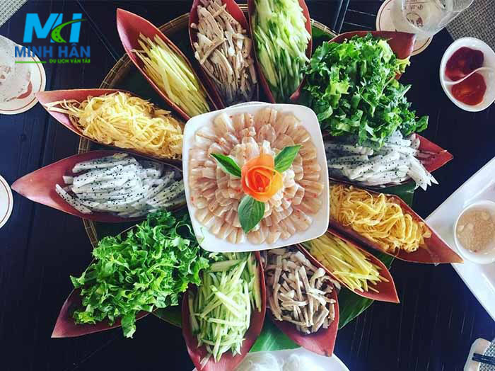 Lẩu thả thường được đặt trong mẹt tre lót lá chuối, tạo hình bông hoa đẹp mắt với những nguyên liệu được sắp xếp vào từng lớp bẹ chuối màu đỏ hồng trông rất hấp dẫn. Phần “nhụy hoa” là đĩa cá mai đặt ở chính giữa.