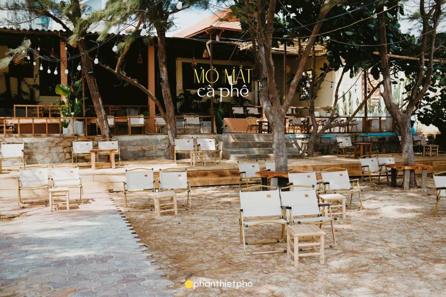 Nằm trên con đường Lê Lợi, ngay bãi biển Hưng Long, Mở mắt cà phê là quán cà phê ven biển mang dáng vẻ mộc mạc với chất liệu gỗ là chủ yếu, không gian quán thoáng đãng, thoải mái vì các bàn ghế xếp xa nhau.