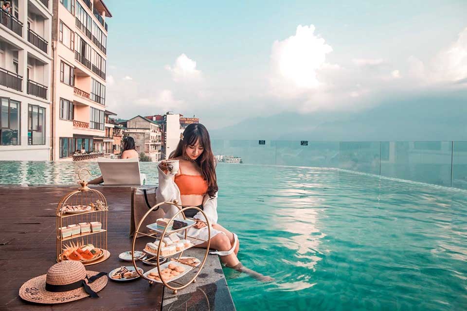 14h00: Tắm hồ bơi vô cực, tắm giàn phun, ôn tuyền, thác nước...